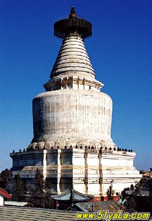 元世祖忽必烈崇信佛法,迎释迦佛舍利,至元八年(1271)在大都城西南修建了这座大型喇嘛塔。至元十六年(1279)建成后,又在塔前建了一座规模宏大的寺院,救名"大圣寿万安寺"。寺院殿堂栏楯一如内廷,佛像 窗壁皆饰金,是元朝皇室在大都兴建的重要工程之一。1368年全部殿堂被雷火焚毁,仅白塔幸免。明宣德八年修复,改称妙应寺。清康熙、乾隆间又几经修葺,现仅白塔为元代遗物。寺由四层殿堂和塔院组成。院中间耸立着白塔,四周各建小角亭一座。白塔由塔基、塔身和塔刹3部分组成。台基高9米,塔高50.9米,底座面积1422平 方米,台基分三层,最下层呈方形,台前有一通道,前设台阶,可直登塔基,上、中二层是亚字形的须弥座。台基上砌基座,将塔身、基座连接在一起。莲座上又有5条环带,承托塔身。塔身俗称"宝瓶",形似覆钵,上安7条铁箍,其上又有亚字形小型须弥座,再上就是13天相轮,顶端为一直径9.7米的华盖,华盖以厚木作底,上置铜板瓦并做 成40条放射形的筒脊,华盖四周悬挂着36副铜质透雕的流苏和风铃,微风吹动,铃声悦耳。华盖中心处,还有一座高约5米的鎏金宝顶,以8条粗壮的铁链将宝顶固定在铜盘之上。