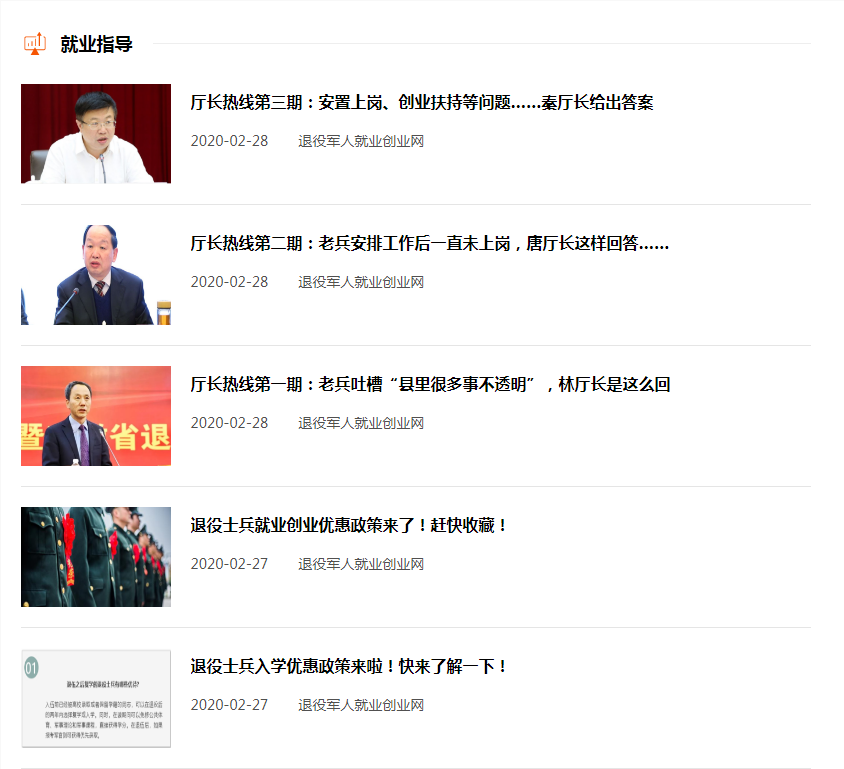 目前,强军网借助“就业创业服务平台”,及时更新相关信息,为即将退役的官兵和军人家属提供就业信息咨询、就业岗位培训、法规政策支持等全流程服务,并累计发布退役服务及政策信息8825组,退役就业岗位531977个。强军网“就业创业服务平台”由退役军人事务部就业创业司和解放军新闻传播中心网络部共同主办。