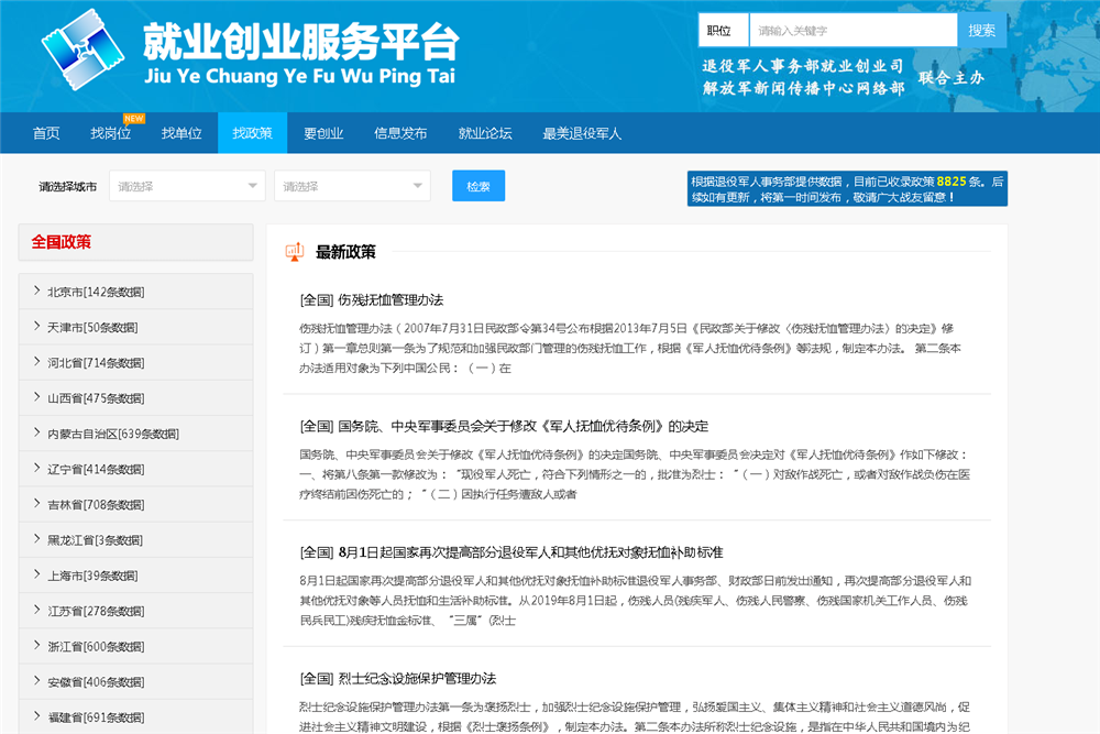 “找政策”主要显示全国及各省市最新退役军人相关政策规定