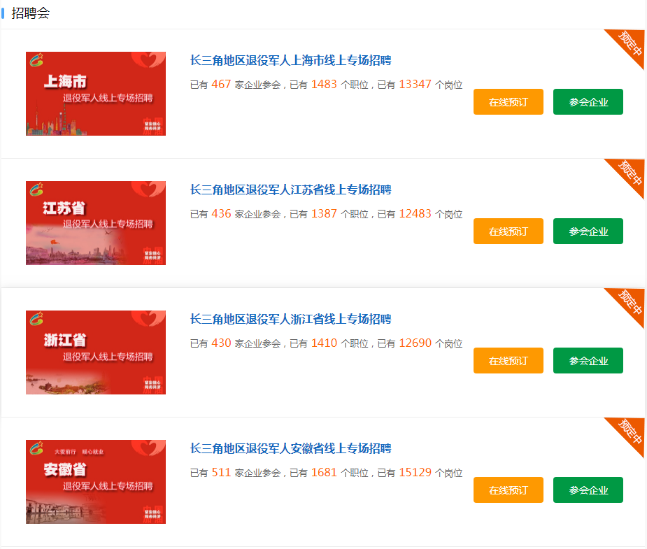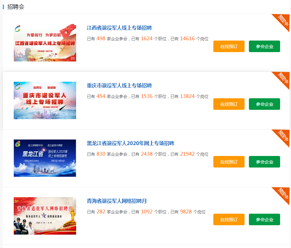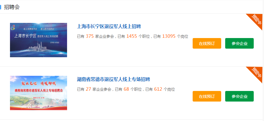 今年2月以来,上海市退役军人事务局、江苏省退役军人事务厅、浙江省退役军人事务厅、安徽省退役军人事务厅、江西省退役军人事务厅、黑龙江省退役军人事务厅、重庆市退役军人事务局,湖南省常德市退役军人事务局等单位在网上陆续推出专场招聘活动,吸引了众多优质企业入驻,形成了政府主导、企业用工、退役军人就业的人才供需互动良好局面。下一步,多地线上招聘活动还将陆续展开,为退役军人就业创业提供更多优质资源。